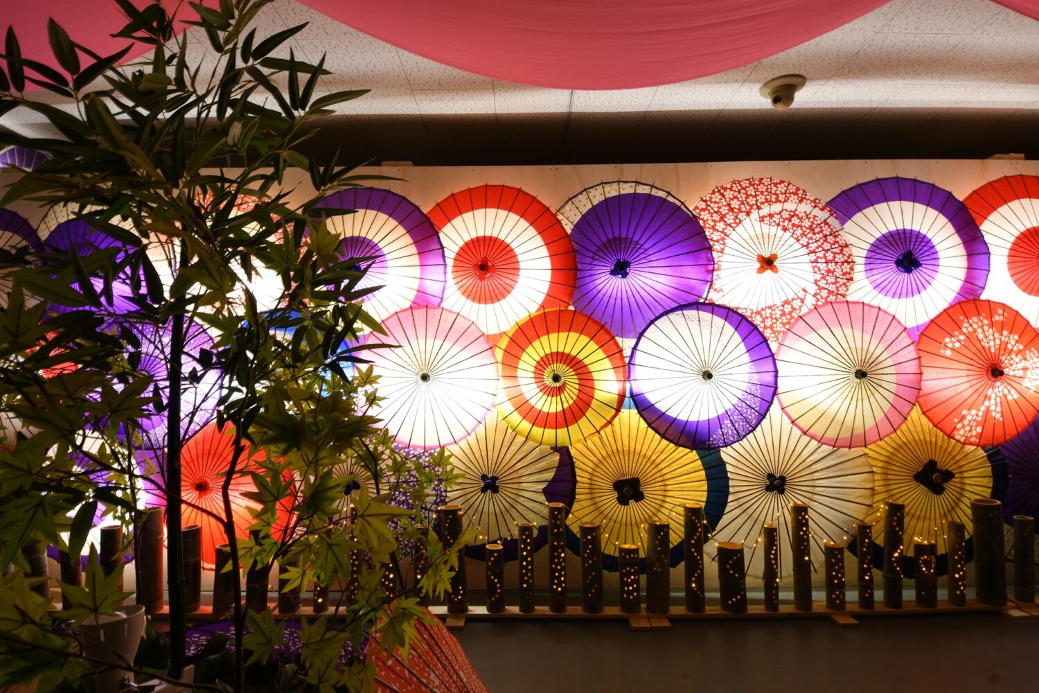 和傘の彩りと竹のぬくもりが調和し、まるで“秋の光の庭園”のような美しさを見せています。