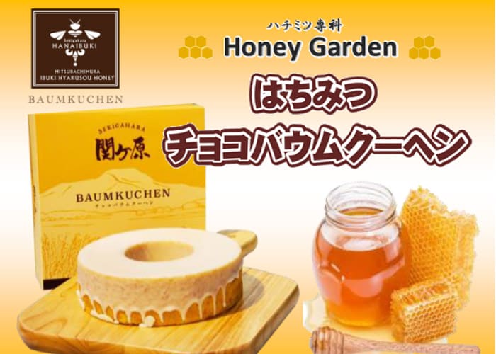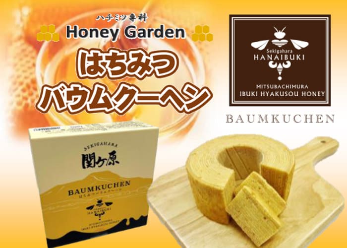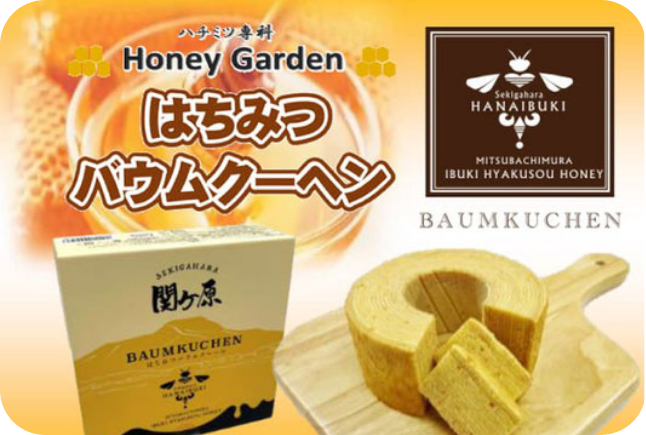 薬草の宝庫伊吹山で採れた伊吹百草蜜を使用したオリジナルバウムクーヘン。はちみつを限界までたっぷり混ぜることにより『 しっとり食感 』 が口の中に広がり豊潤な甘さが至福のひと時を演出します。