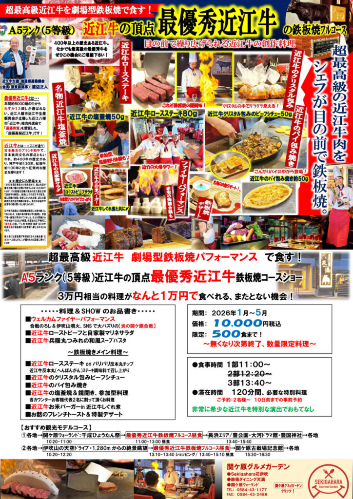 ウェルカム ファイヤーパフォーマンス 近江牛ロースステーキ 80g 近江牛パイ包み 50g 近江牛塩釜焼き 50g 近江牛クリスタル包みビーフシチュー 近江牛お米バーガー 近江牛ローストビーフサラダ 近江牛スープパスタ 鉄板焼きデザート